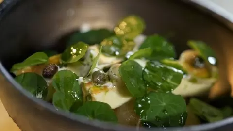 Начальный этап – это приготовления омлета: в миске нужно соединить яйца, 20 г сливок, тертый пармезан, приправить солью и перцем. Далее масса перемешивается до однородной консистенции, перекладывается в вакуумный пакет и помещается в кипящую воду на 10 минут. После этого омлет остужается и нарезается на ровные пласты. Для обжаривания на сковороде потребуется сливочное масло, в которое помещаются кусочки омлета, чтобы подрумянить их с обеих сторон, добавив чеснок, тимьян и каперсы для аромата.