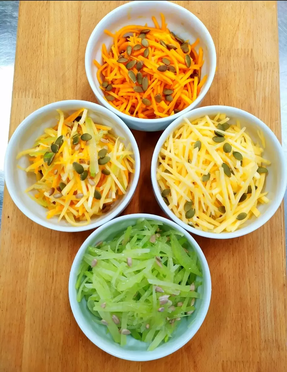Репу, редьку и тыкву необходимо очистить и натереть на терке соломкой. Затем смешать мёд, воду и лимонный сок. Овощи можно заправить отдельно или объединить и посыпать семечками перед подачей на стол.