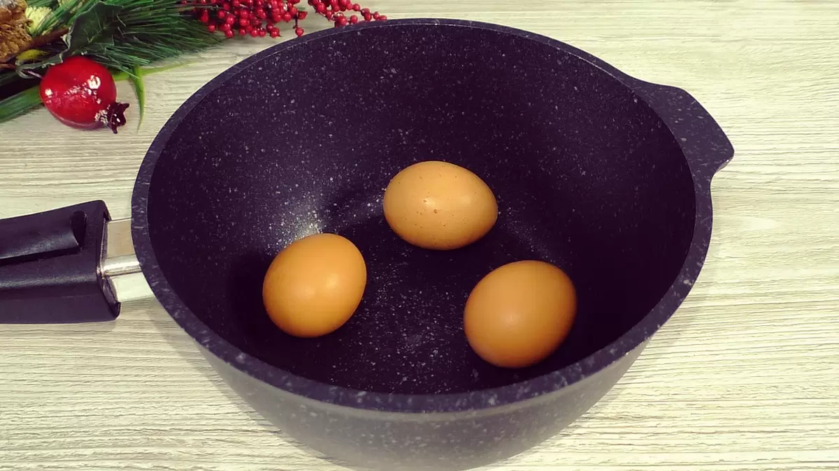 Процесс начинается с обычной варки яиц. Например, можно взять два яйца, которые уже полежали некоторое время, и одно свежее. Они должны быть полностью погружены в холодную воду и вариться около 13 минут.