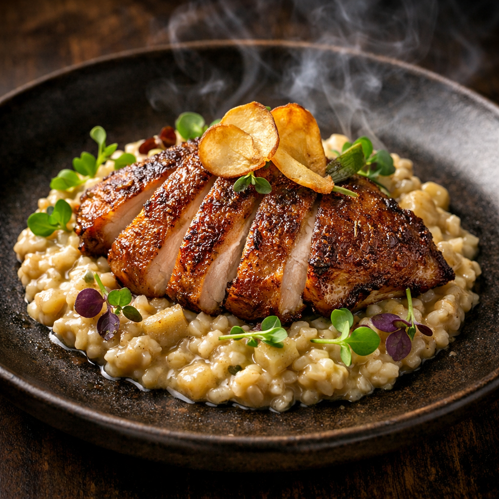 Цесарка – это не просто птица, а настоящий гастрономический шедевр с плотным и ароматным мясом, которое великолепно раскрепощается при умеренной тепловой обработке. В этом изысканном рецепте предлагается уникальная техника двойного конфи: мясо сначала медленно томится в утином жире с добавлением пряных трав, что делает его невероятно нежным, а затем обжаривается до золотистой корочки с лёгким дымком. Получается совершенное сочетание – сочное и тающее во рту мясо на фоне хрустящей, ароматной кожи.