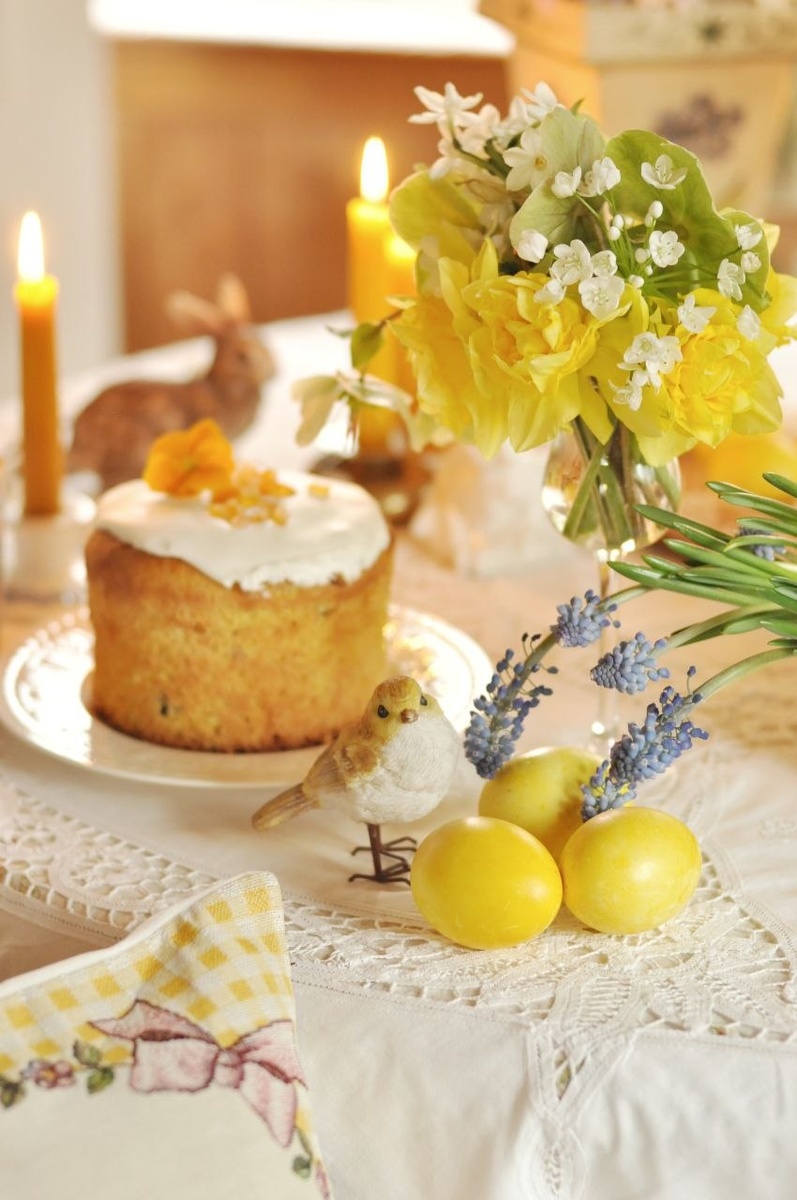 - Акценты в голубоватых и синих цветах — например, мускарики или формочки для куличей